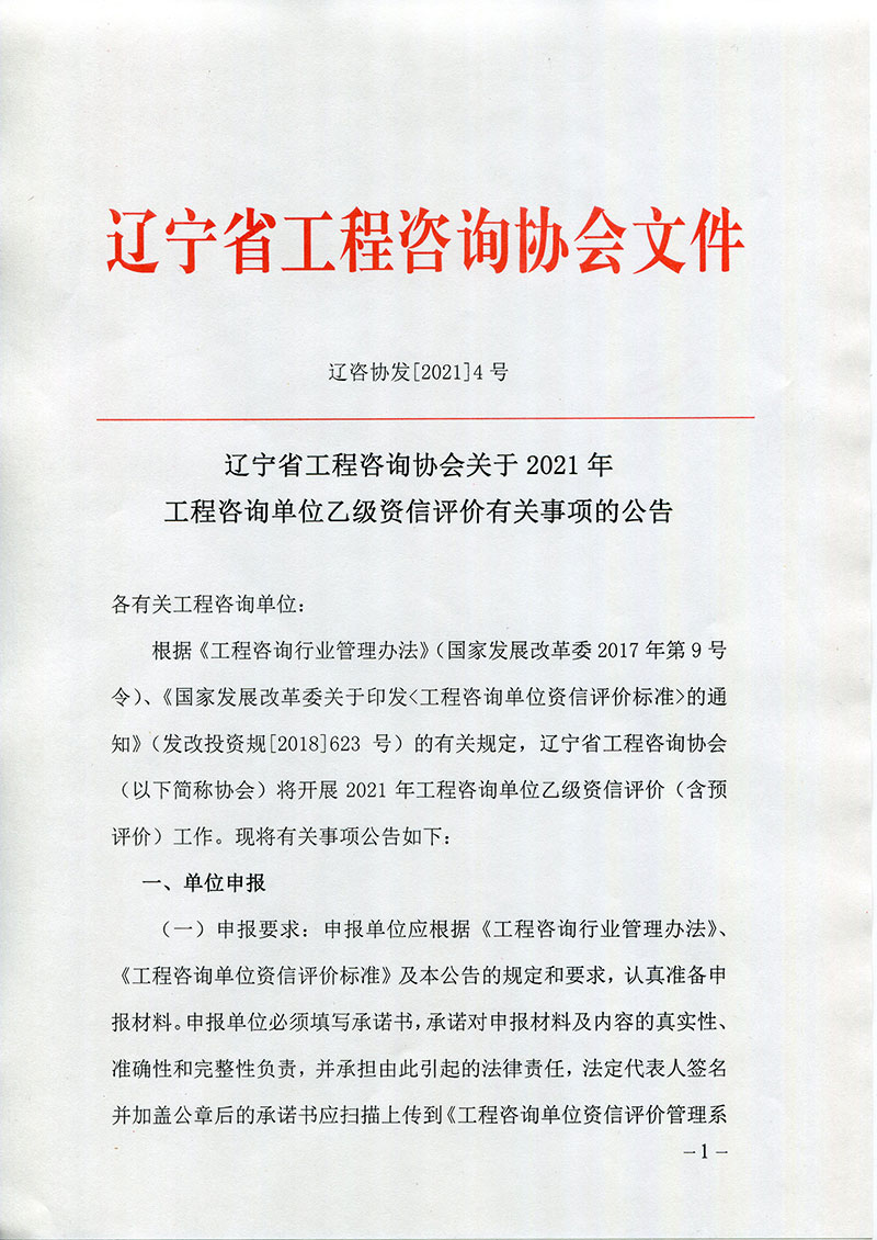 遼寧省工程咨詢協(xié)會關于2021年工程咨詢單位乙級資信評價有關事項的公告