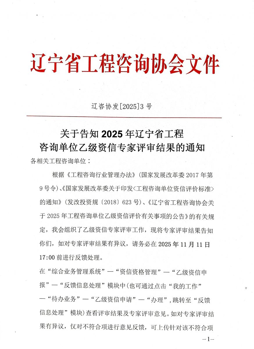 關(guān)于告知2025年遼寧省工程 咨詢單位乙級(jí)資信專家評(píng)審結(jié)果的通知
