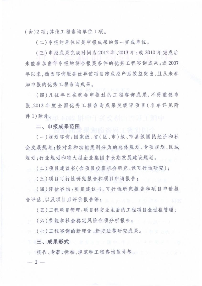 中國工程咨詢協(xié)會(huì)關(guān)于申報(bào)2014年度全國優(yōu)秀工程咨詢成果獎(jiǎng)的通知