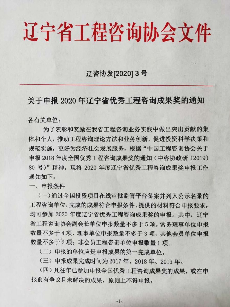關(guān)于申報(bào)2020年遼寧省優(yōu)秀工程咨詢成果獎(jiǎng)的通知